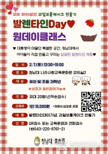청남대는 오는 2월 7일, 청남대 내 나라사랑교육문화원에서 어린이를 대상으로 ‘꼬마 파티쉐의 과일보틀케이크 만들기’원데이 클래스를 운영한다.