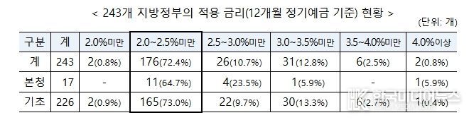 전국 243개 지방정부의 금고 이자율을 조사한 결과, 12개월 이상 정기예금 금리는 전국 평균 2.53%(공개 이자율 기준)로 집계됐다.