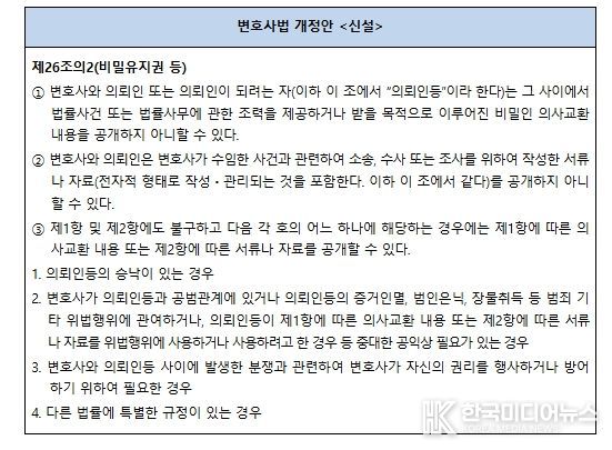 개정안은 ‘변호사와 의뢰인이 주고받은 법률상담 내용’이나, ‘변호사가 작성한 의견서’ 등을 비밀유지권으로 보호하고, ‘의뢰인이 공개에 동의한 경우’, ‘범죄와 관련되어 있는 경우’ 등 비밀유지권이 인정되지 않는 예외 사유를 규정하는 것을 주요 내용으로 한다.