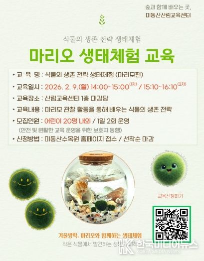 [ 한국미디어뉴스 김풍옥 기자 ] 충청북도산림환경연구소는 겨울방학을 맞은 어린이를 대상으로 오는 2월 9일 미동산수목원 내 산림교육센터에서 '식물의 생존 전략 생태체험(마리모 편)'을 운영한다.