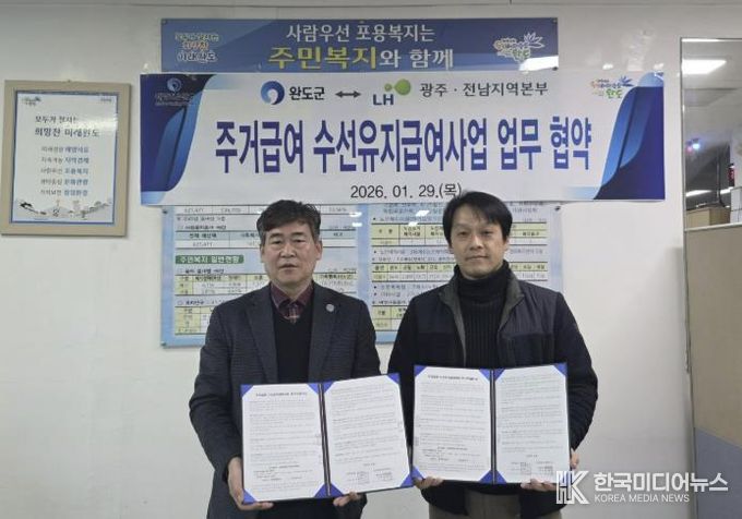 [ 한국미디어뉴스 이종철 기자 ] 완도군은 지난 29일 LH(한국토지주택공사 광주전남지역본부)와 함께 주거 급여 수급자 가구의 주거비 부담을 덜어주기 위한 업무 협약을 체결했다.