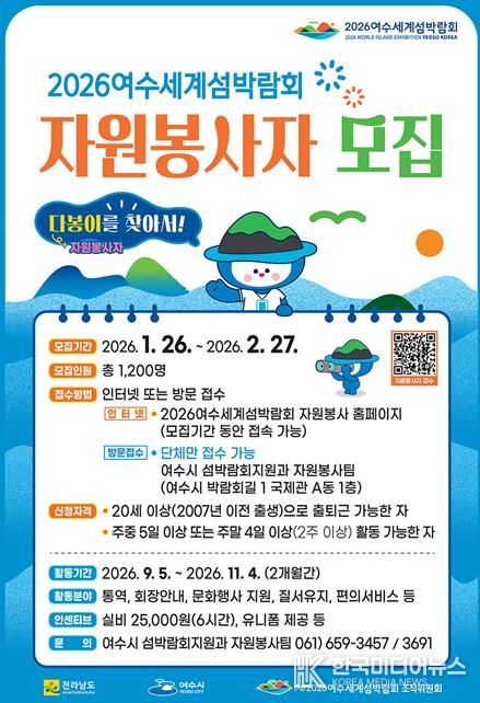 한편, 자원봉사자 신청은 2026여수세계섬박람회 자원봉사 누리집을 통해 온라인으로 접수할 수 있으며 활동에 참여한 다봉이에게는 1일 6시간 기준 활동 실비 2만 5천 원이 지급될 예정이다.