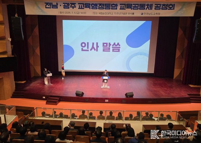 [ 한국미디어뉴스 이종철 기자 ] 김정희 전남도의회 교육위원장은 2월 6일 순천대학교 우석홀에서 열린 '전남·광주 교육행정통합 교육공동체 공청회'에 참석해, 전남·광주 교육행정통합 논의의 핵심 가치로 ‘교육 중심의 통합’을 강조했다.