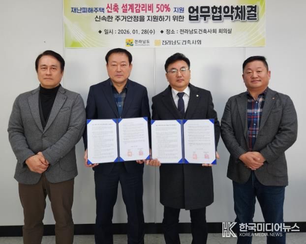 문인기 전남도 건설교통국장은 “협약을 통해 재난 피해 주민이 보다 빠르게 일상과 주거를 회복하도록 민·관 협력을 한층 강화하겠다”며 “도민의 안전과 주거 안정을 최우선에 두고 재난 대응 체계를 지속해서 보완하겠다”고 말했다.
