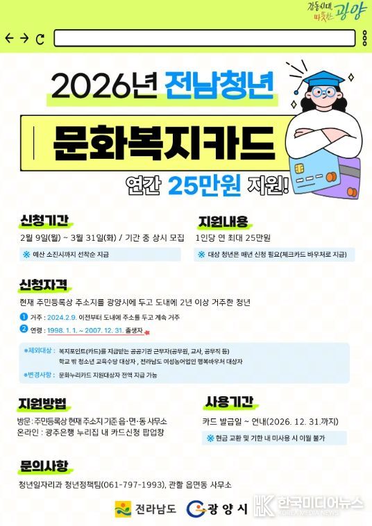 [ 한국미디어뉴스 이종철 기자 ] 광양시는 도내 청년들의 문화 향유 기회 확대와 자기계발을 지원하기 위해 ‘2026년 전남청년 문화복지카드 지원사업’ 신청 접수를 2월 9일부터 실시한다고 밝혔다.