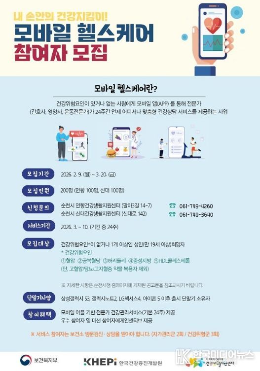 [ 한국미디어뉴스 이종철 기자 ] 순천시는 ICT 기반 공공형 건강관리서비스인 ‘2026년 보건소 모바일 헬스케어 사업’ 참여자를 모집한다고 밝혔다.