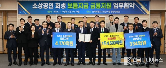 도는 10일 도청에서 김관영 도지사를 비롯해 한종관 전북신용보증재단 이사장, 11개 시군, 8개 금융기관, 소상공인연합회가 참석한 가운데 ‘2026년 소상공인 회생 보듬자금 지원사업’ 업무협약을 체결했다.