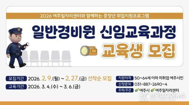 [ 한국미디어뉴스 이원영 기자 ] 여주시는 중장년층의 재취업을 돕기 위해 2026년 여주시 중장년 일반경비원 신임교육과정 교육생을 모집한다고 밝혔다.