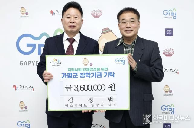 [ 한국미디어뉴스 김서안 기자 ] 김정범 가평읍 힐스테이드 입주자 대표가 9일 가평군을 방문해 장학기금 360만 원을 기탁했다. 이번 장학금 기탁은 지역 학생들의 꿈과 미래를 응원하기 위해 마련됐다.