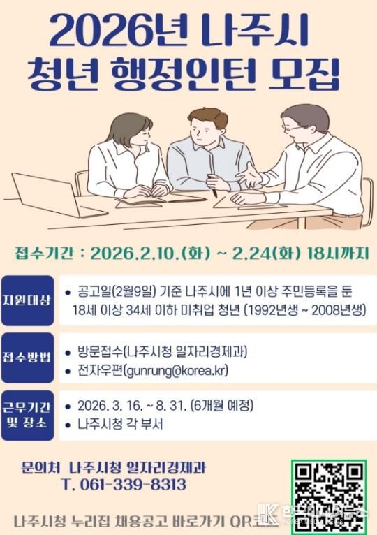 [ 한국미디어뉴스 이종철 기자 ] 전라남도 나주시가 청년들에게 안정적인 행정 실무 경험과 취업 역량을 제공하기 위해 올해 처음으로 청년 행정인턴제를 도입하고 공개 모집에 나섰다.