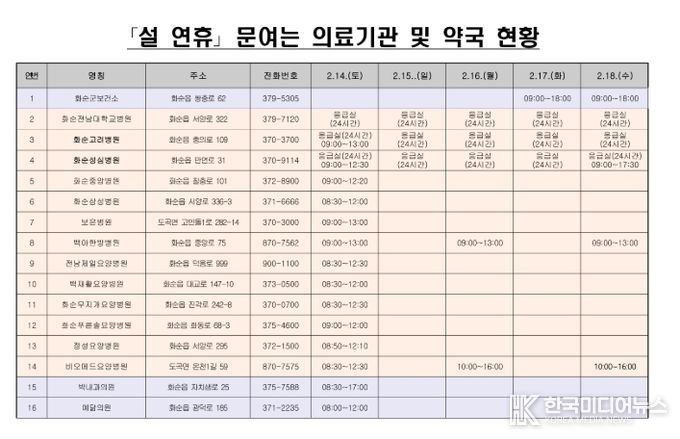 [ 한국미디어뉴스 이종철 기자 ] 화순군은 설 명절을 맞아 귀성객과 군민의 안전을 위해 오는 2월 14일부터 2월 18일까지 비상응급의료 상황반을 운영한다고 밝혔다.
