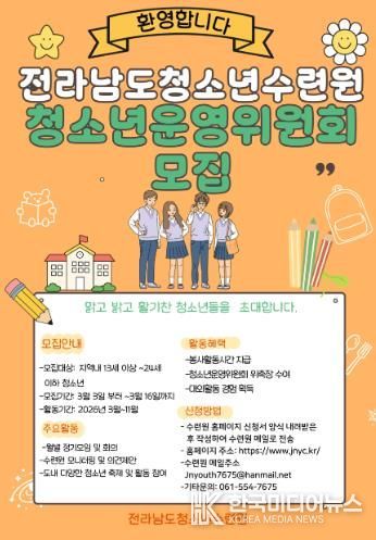 [ 한국미디어뉴스 이종철 기자 ] 전라남도청소년수련원은 2026년 전라남도청소년수련원 청소년운영위원회를 오는 3월 3일부터 3월 16일 18시까지 지역 내 청소년을 대상으로 모집한다.