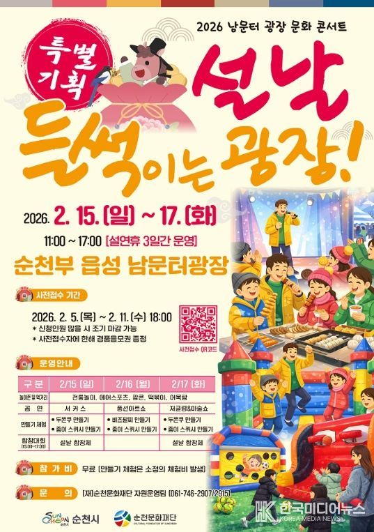 [ 한국미디어뉴스 이종철 기자 ] 순천시는 설 연휴를 맞아 ‘설날, 들썩이는 광장!’ 행사를 오는 15일부터 17일까지 3일간, 오전 11시부터 오후 5시까지 순천부 읍성 남문터 광장에서 개최한다고 밝혔다.
