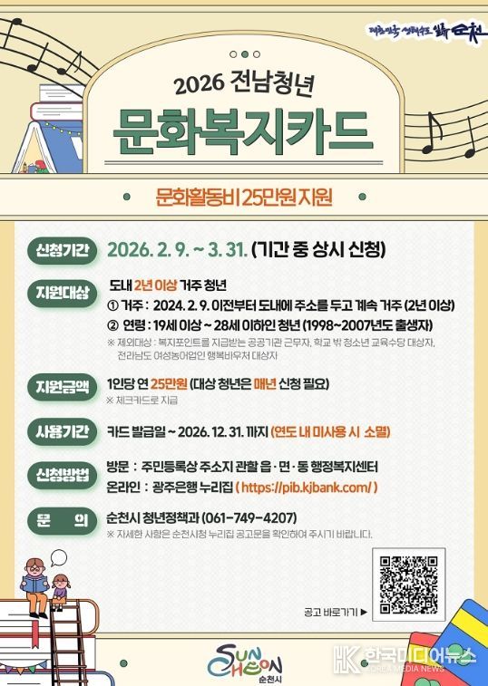 [ 한국미디어뉴스 이종철 기자 ] 순천시는 청년들의 문화생활 향유 및 자기계발 활동을 지원하기 위해 2026년 전남청년 문화복지카드 지원사업 대상자를 오는 3월 31일까지 모집한다.