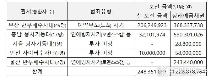 특히, 부산청 반부패수사대에서는 금융회사 28개 대상 484개 계좌를 분석하고, 가상자산, 부동산 보유 명세를 확인하여 부동산 · 자동차 등 5억 7,460만 원(장래예금채권 포함)을 보전 신청했고, 서울청 형사기동대에서는 송환자와 같은 범죄조직에 소속되어 국내에서 인출책으로 활동한 공범 2명까지 추적하여 위 보전 금액과 별도로 737만 원(장래예금채권 포함)을 추가 보전했다.