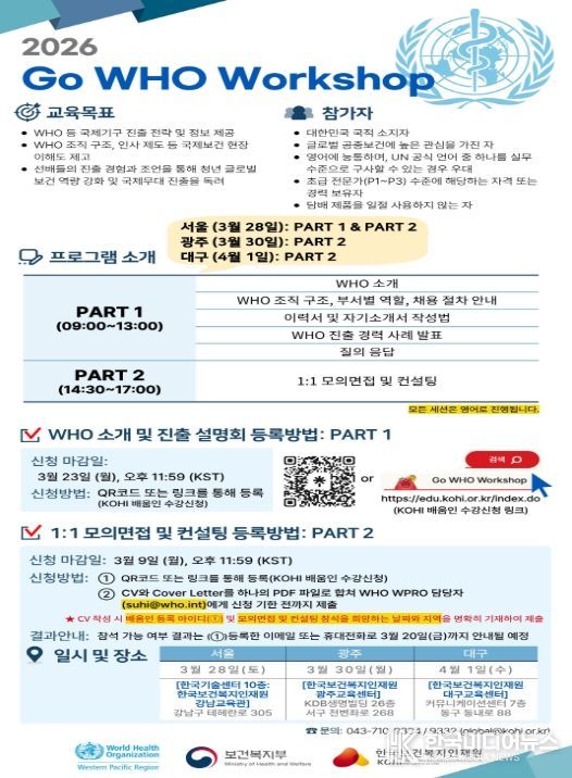 이번 워크숍은 3월 28일부터 4월 1일까지 서울, 광주, 대구에서 개최되며, 보건분야 국제기구 진출을 희망하는 대한민국 청년들에게 진출 관련 정보를 적극적으로 제공하기 위해 기획됐다.