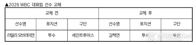 [ 한국미디어뉴스 황영수 기자 ] KBO 전력강화위원회는 부상으로 인해 WBC 참가가 어려워진 세인트루이스 라일리 오브라이언을 대체할 선수로 두산 김택연을 확정하고 WBC 조직위에 선수 교체 승인을 요청했다.