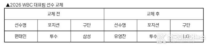 [ 한국미디어뉴스 황영수 기자 ] KBO 전력강화위원회는 부상으로 인해 WBC 참가가 어려워진 삼성 원태인을 대체할 선수로 LG 유영찬을 확정하고 WBC 조직위에 선수 교체 승인을 요청했다.
