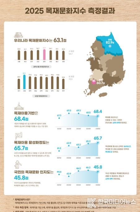 [ 한국미디어뉴스 이원영 기자 ] 산림청은 전국 17개 광역시·도를 대상으로 목재문화 정착 및 진흥 수준을 평가한 ‘2025년 목재문화지수’ 결과를 30일 발표했다. 이 지수는 지역별 목재이용기반구축, 활성화, 목재문화 인지도 세 지표를 종합 평가한다.
