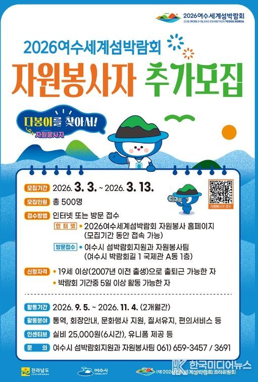 [ 한국미디어뉴스 이종철 기자 ] 여수시가 2026여수세계섬박람회의 성공적인 개최를 위해 박람회의 주역이 될 자원봉사자, 공식 애칭 ‘다봉이’ 추가 모집에 나선다.