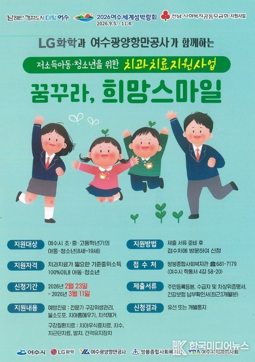 [ 한국미디어뉴스 이종철 기자 ] 여수시는 민·관이 협력해 저소득 아동·청소년의 구강건강 증진을 위한 치과치료 지원사업 '2026 꿈꾸라, 희망스마일'을 추진한다고 밝혔다.