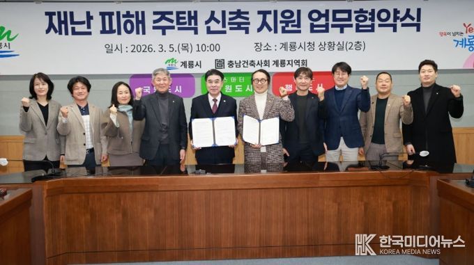 [ 한국미디어뉴스 이원영 기자 ] 충남 계룡시는 5일 시청 상황실에서 충남건축사회 계룡지역회(회장 류욱형)와 ‘재난 피해 주택 신축지원을 위한 업무협약’을 체결했다고 밝혔다.