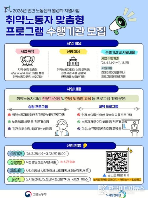 [ 한국미디어뉴스 이원영 기자 ] 고용노동부 노사발전재단은 민간 노동센터·비영리단체 등이 지역별 특성과 취약노동자의 다양한 노동환경을 반영한 맞춤형 프로그램을 기획·운영할 수 있도록 '2026년 취약노동자 맞춤형 프로그램' 지원 사업을 추진한다고 밝혔다.