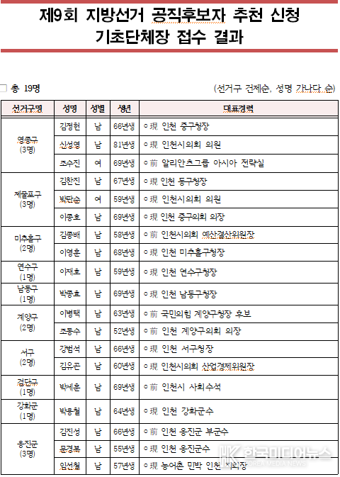 [한국미디어뉴스 이원영기자] 국민의힘 인천시당 공천관리위원회는 지난 5일부터 8일까지 4일간 제9회 지방선거 기초단체장 출마 희망자의 접수를 진행했다. 이번 접수에는 총 19명이 신청했다. 광역단체장과 부평구 기초단체장은 중앙당 공천관리위원회가 심사한다.