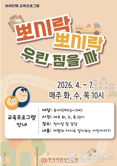 [ 한국미디어뉴스 이원영 기자 ] 인천광역시 한국이민사박물관은 유아 단체교육 '뽀시락 뽀시락 우린 짐을 싸'를 운영한다고 밝혔다.