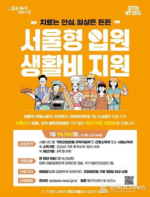 [ 한국미디어뉴스 이원영 기자 ] 서울시는 일하는 시민이 치료를 위한 입원이나 건강검진으로 발생하는 소득 공백을 지원하는 ‘서울형 입원생활비 지원’ 사업의 지원 기준을 완화하고 1일 지원 금액을 96,960원으로 확대한다고 밝혔다.