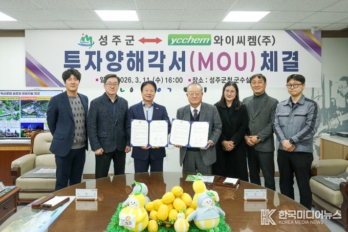 [ 한국미디어뉴스 이보영 기자 ] 성주군은 3월 11일 군수실에서 와이씨켐㈜과 투자양해각서(MOU)를 체결하고, 투자사업의 원활한 추진을 위한 상호 협력에 나섰다.