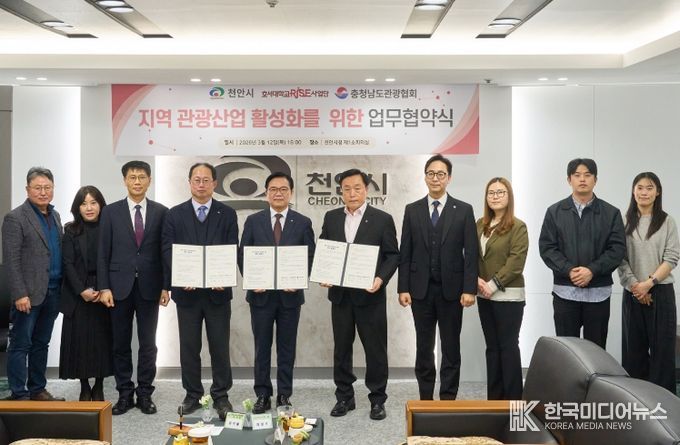 천안시는 12일 시청 제1소회의실에서 호서대학교 RISE사업단, 충남관광협회와 ‘지역 관광산업 활성화를 위한 업무협약’을 체결했다.