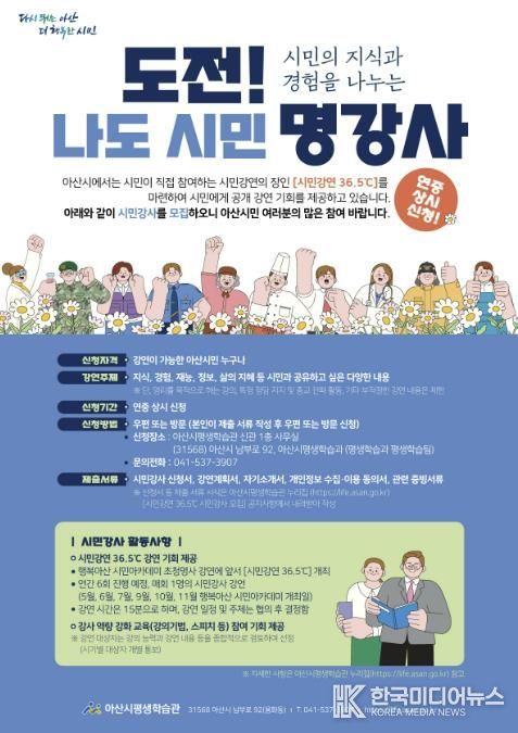 [ 한국미디어뉴스 이원영 기자 ] 아산시는 시민 각자의 지식과 삶의 이야기를 공유하는 참여형 프로그램 '시민강연 36.5℃'에 함께할 시민강사를 모집한다.
