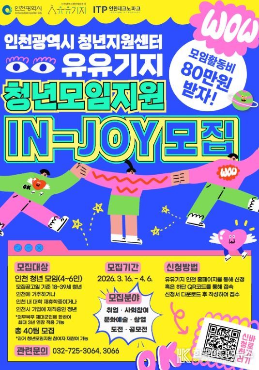 [ 한국미디어뉴스 이원영 기자 ] 인천테크노파크(인천TP)는 인천광역시 청년지원센터 ‘유유기지’에서 운영하는 ‘청년모임지원(IN-JOY)’ 프로그램에 참여할 40개 팀을 다음 달 6일까지 모집한다고 밝혔다.