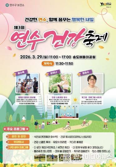 [ 한국미디어뉴스 이원영 기자 ] 연수구는 오는 3월 29일 송도해돋이공원 잔디광장 일대에서 구민 누구나 참여하고 즐길 수 있는 ‘제3회 연수 건강축제’를 개최한다.