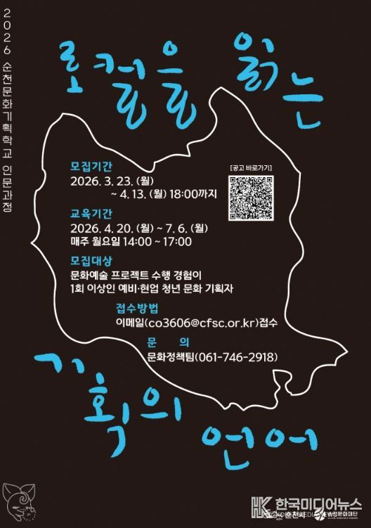 [ 한국미디어뉴스 이종철 기자 ] (재)순천문화재단은 오는 13일까지 ‘2026 순천문화기획학교 인문과정 '로컬을 읽는 기획의 언어'(이하 인문과정)’ 수강생을 공개 모집한다.