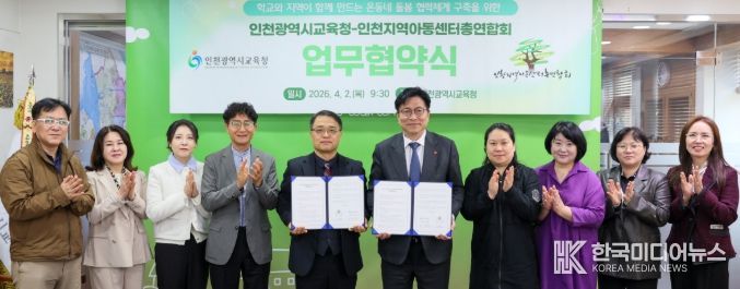 [ 한국미디어뉴스 이원영 기자 ] 인천광역시교육청은 지난 2일, 인천지역아동센터총연합회(회장 신준범)와 ‘학교와 지역이 함께 만드는 온동네 돌봄 협력체계 구축’을 위한 업무협약을 체결했다.