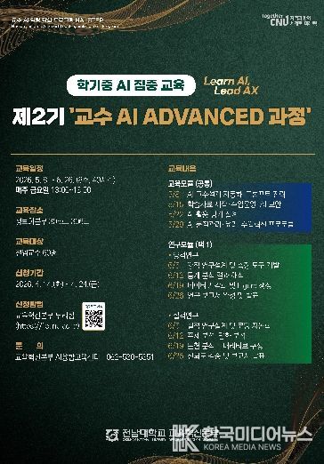 [ 한국미디어뉴스 이종철 기자 ] 전남대학교 교육혁신본부는 전임교원의 AI 활용 교수설계 및 연구 역량 강화를 위한 ‘제2기 교수 AI ADVANCED 과정’을 학기 중 운영한다.