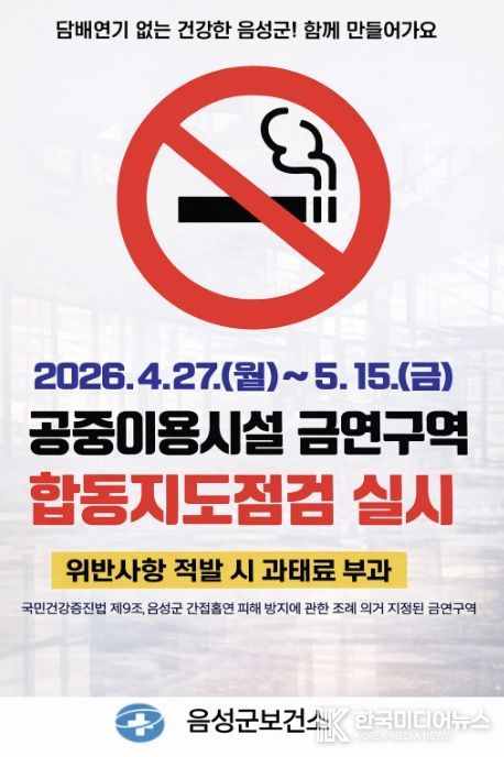 [ 한국미디어뉴스 김풍옥 기자 ] 음성군보건소는 오는 27일부터 5월 15일까지 음성군 소재 공중이용시설 금연구역 점검과 함께 금연구역 내 흡연행위 단속을 강화한다고 밝혔다.