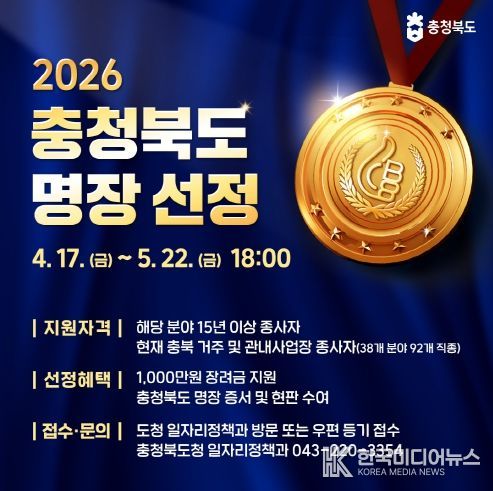[ 한국미디어뉴스 김풍옥 기자 ] 충북도는 산업현장에서 최고 수준의 숙련기술을 보유한 ‘2026년도 충청북도명장’을 선정한다고 17일 밝혔다.