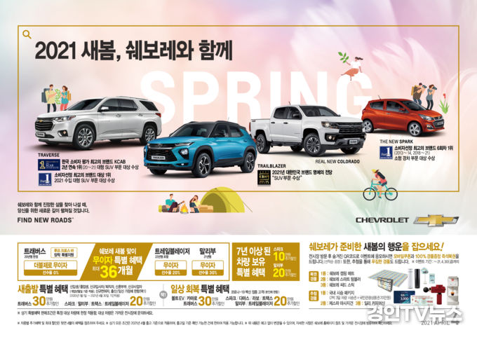 한편, 쉐보레는 공식 홈페이지 및 전국 쉐보레 전시장에서 이달 30일까지 경품 이벤트를 진행한다. 참여를 원하는 고객은 쉐보레 홈페이지 이벤트 페이지에서 새출발 구매 혜택 확인 후 응모할 수 있으며, 전시장 방문 고객은 차량 내 QR코드를 스캔 후 현장에서 응모할 수 있다. 쉐보레는 응모 고객 중 추첨을 통해 쉐보레 차량 시승권과 20만원 상당의 여행상품권, 제스파 마사지 건, 일리 커피 머신 등 푸짐한 경품을 제공할 예정이다. 또한, 전시장 방문 고객에게 스크래치 카드를 제공하며, 이를 통해 대형 캠핑 매트, 스마트 텀블러 등 즉석 경품 뽑기 이벤트 참여 기회를 제공한다.
