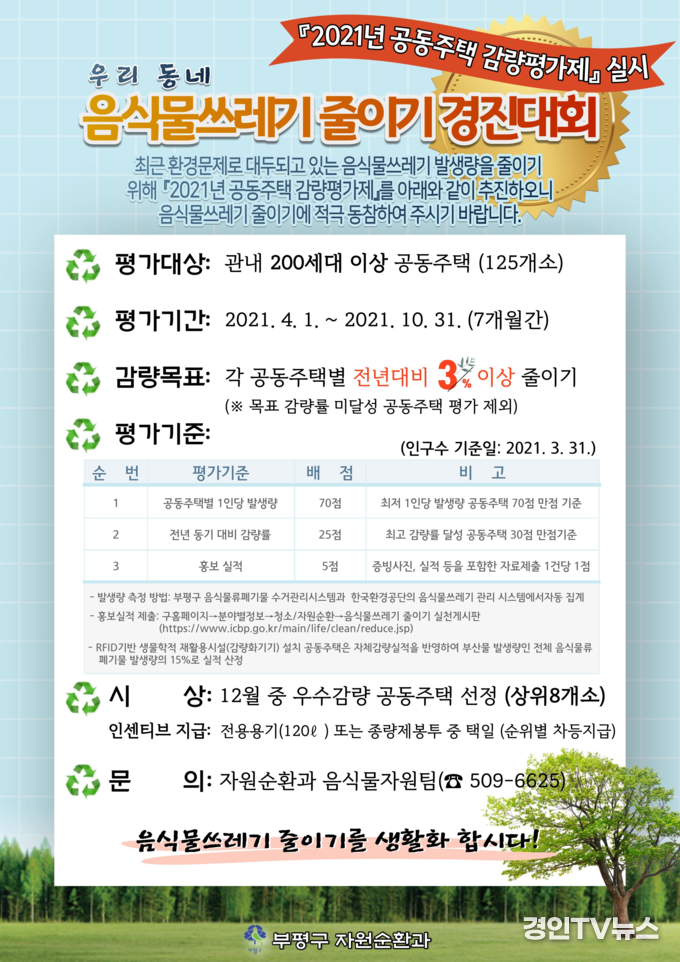 [ 경인TV뉴스 이원영 기자 ] 인천 부평구(구청장 차준택)는 5일 지역 내 200가구 이상 공동주택 125곳을 대상으로 ‘공동주택 감량평가제’를 실시한다고 5일 밝혔디.