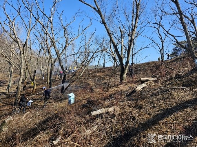산림당국은 산불진화헬기 2대(지자체 2), 산불진화장비 10대(지휘차 1, 진화차 4, 소방차 5), 산불진화대원 35명(공무원 5, 소방 25, 기타 5) 투입하여 13시 50분에 주불 진화를 완료했다.
