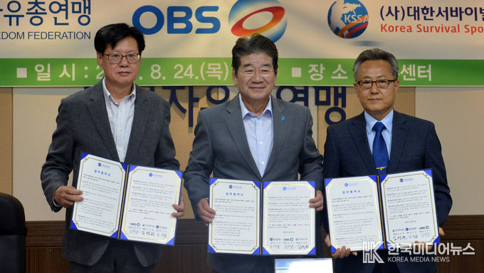 [ 한국미디어뉴스 이원영 기자 ] 한국자유총연맹(총재 강석호, 이하 연맹)은 8월 24일(목) 오전 11시, 서울시 중구 남산에 위치한 자유센터에서 OBS(대표이사 김학균), 대한서바이벌스포츠협회(협회장 김영현)와 자유민주주의 수호 및 안보 지킴이 강화를 위한 각 기관의 역할 증진과 교류 협력을 목적으로 하는 업무협약을 체결했다.
