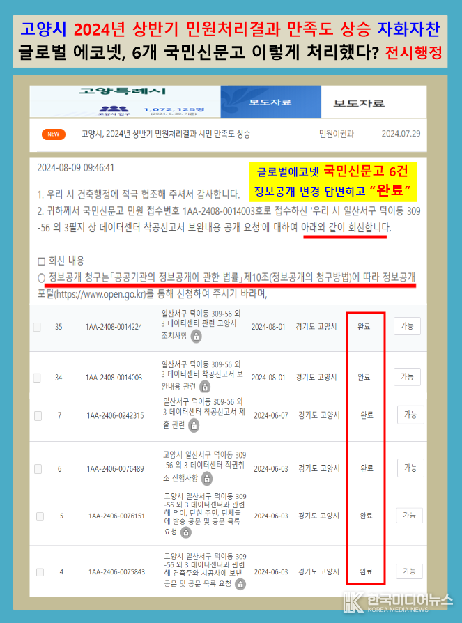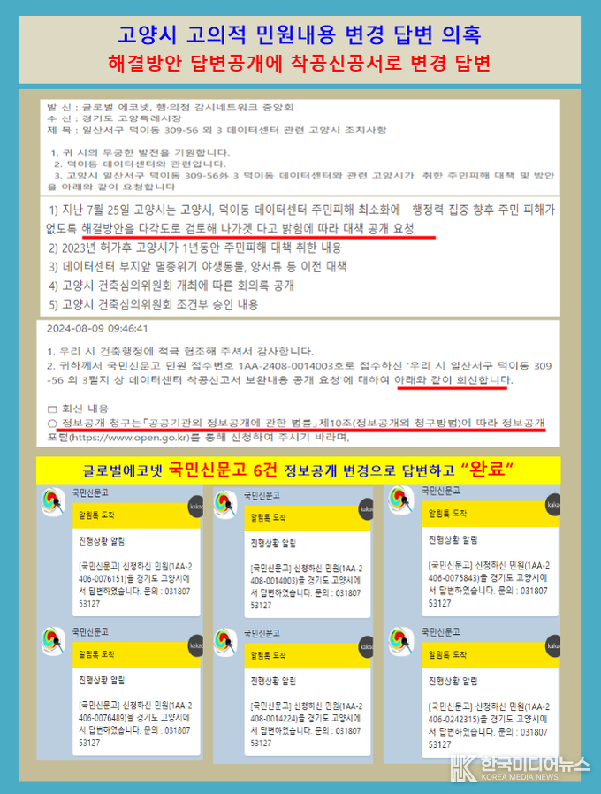 또한 ▲GS건설 착공신고서 신청에 대한 고양시청 보완내용과 진행 상황을 국민신문고에 별도 요청했지만, 고양시는 9일 국민신문고 답변을 통해 국민신문고가 아닌 정보공개로 변경을 촉구하고 2건 민원을 완료했다는 상황에 글로벌 에코넷 등 단체들은 보도자료를 통해 고양시 꼼수 행정을 규탄했다.