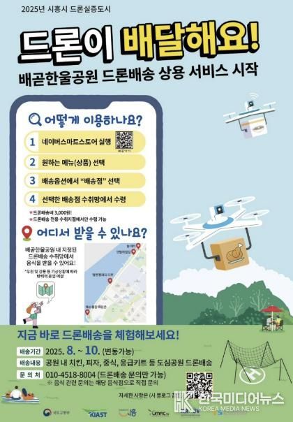 [ 한국미디어뉴스 이보영 기자 ] 시흥시가 국토교통부 ‘2025 드론 실증도시 구축사업’ 공모에 선정돼, 이달부터 10월 말까지 배곧한울공원 일대에서 드론을 활용한 배송 실증사업에 본격 착수한다. 이번 사업은 시흥시가 국비 5억 원을 확보해 추진하는 드론배송 상용화 사업으로, 공원을 찾는 시민들이 드론으로 배달되는 음식을 직접 받아볼 수 있는 체감형 서비스다.