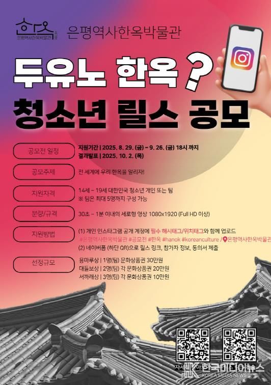 [ 한국미디어뉴스 이보영 기자 ] 서울 은평구는 은평역사한옥박물관에서 대한민국 청소년을 대상으로 릴스 공모전을 개최한다고 밝혔다.