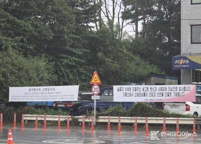 [ 한국미디어뉴스 김서안 기자 ] 지난 7월20일 집중호우로 발생한 매몰 및 실종사고와 관련하여 실종자 가족들이 가평소방서 앞에 감사의 마음을 담은 현수막을 게시해 주위를 훈훈하게 하고 있다.