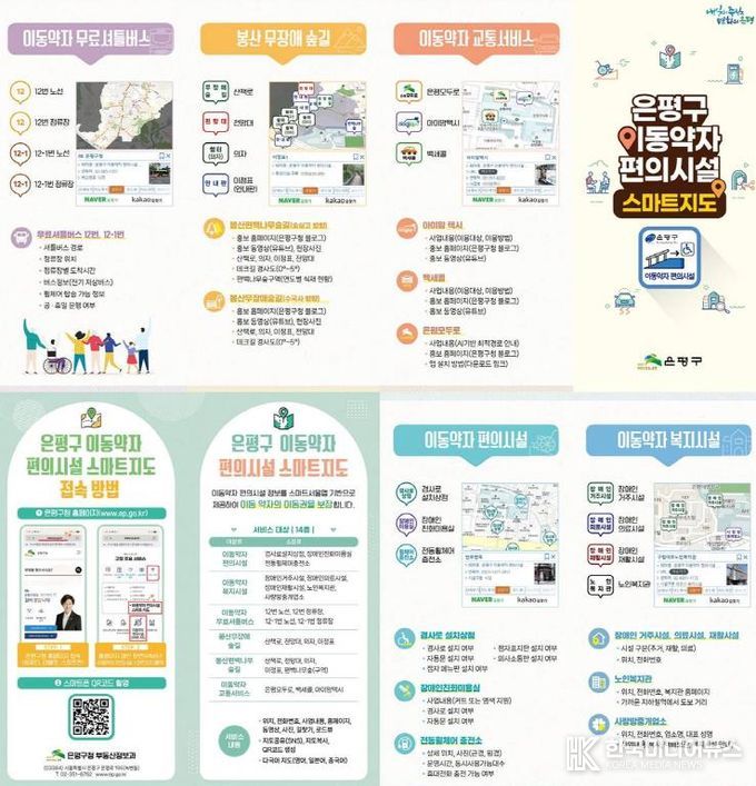 지도에는 경사로가 설치된 상점, 장애인 거주시설, 장애인 친화미용실, 전동휠체어 충전소 등 총 14종의 다양한 편의시설 정보가 담겨있다. 또한 무료 셔틀버스, 아이맘택시, 은평모두로, 백세콜 등 다양한 교통서비스 안내를 함께 제공해 이동 약자의 편의를 높였다.