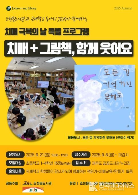 [ 한국미디어뉴스 이원영 기자 ] 제주시 조천읍도서관은 9월 21일 치매극복의 날을 맞아 초등학교 1~4학년 어린이를 대상으로 ‘치매+그림책, 함께 웃어요’ 프로그램을 운영한다.